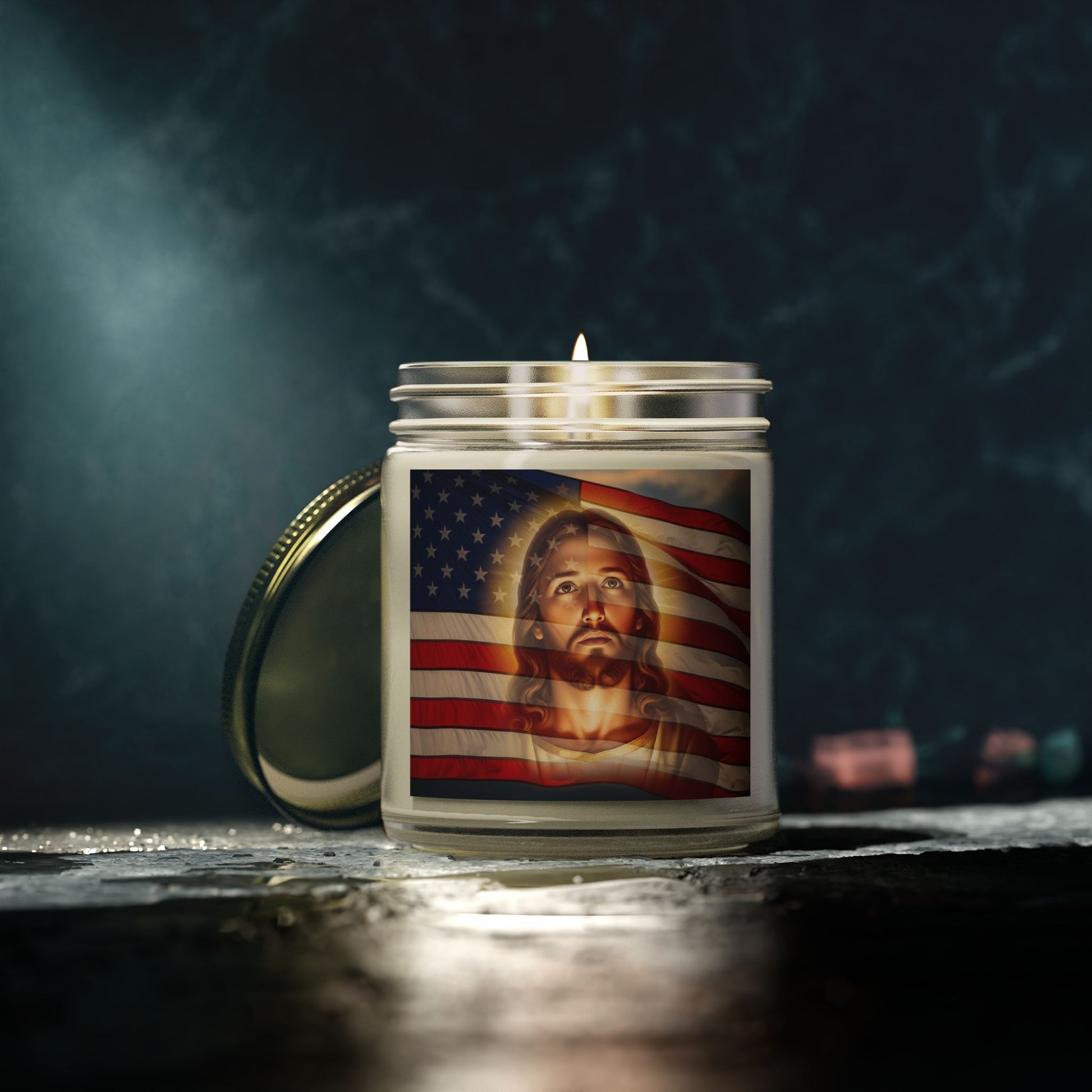 Honor both your faith and your country with this beautifully crafted candle featuring a powerful image of Jesus illuminated within the American flag. This unique design blends the eternal light of Christ with the enduring symbol of American liberty, making it a meaningful centerpiece for prayer, reflection, or patriotic holidays.
